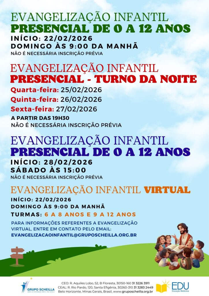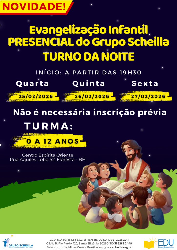 Mais do que transmitir conhecimentos, a Evangelização Infantil do Grupo Scheilla tem por finalidade educar o Espírito, semear o bem e preparar o homem de bem do futuro, por meio de uma metodologia que valoriza o aprendizado natural e gradual, respeitando o ritmo de cada criança e promovendo o desenvolvimento do raciocínio, da observação e do senso moral.