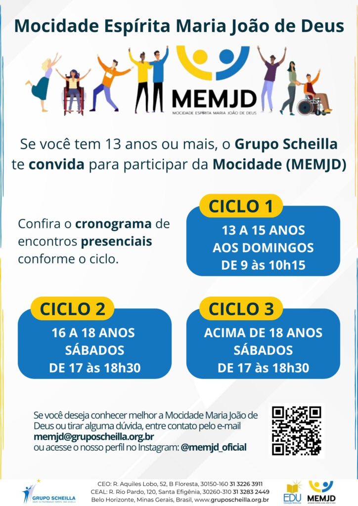 Os jovens interessados em participar da Mocidade Espírita Maria João de Deus, do Grupo da Fraternidade Espírita Irmã Scheilla, são convidados a integrar momentos de estudo, reflexão e convivência fraterna à luz da Doutrina Espírita nos seguintes horários: