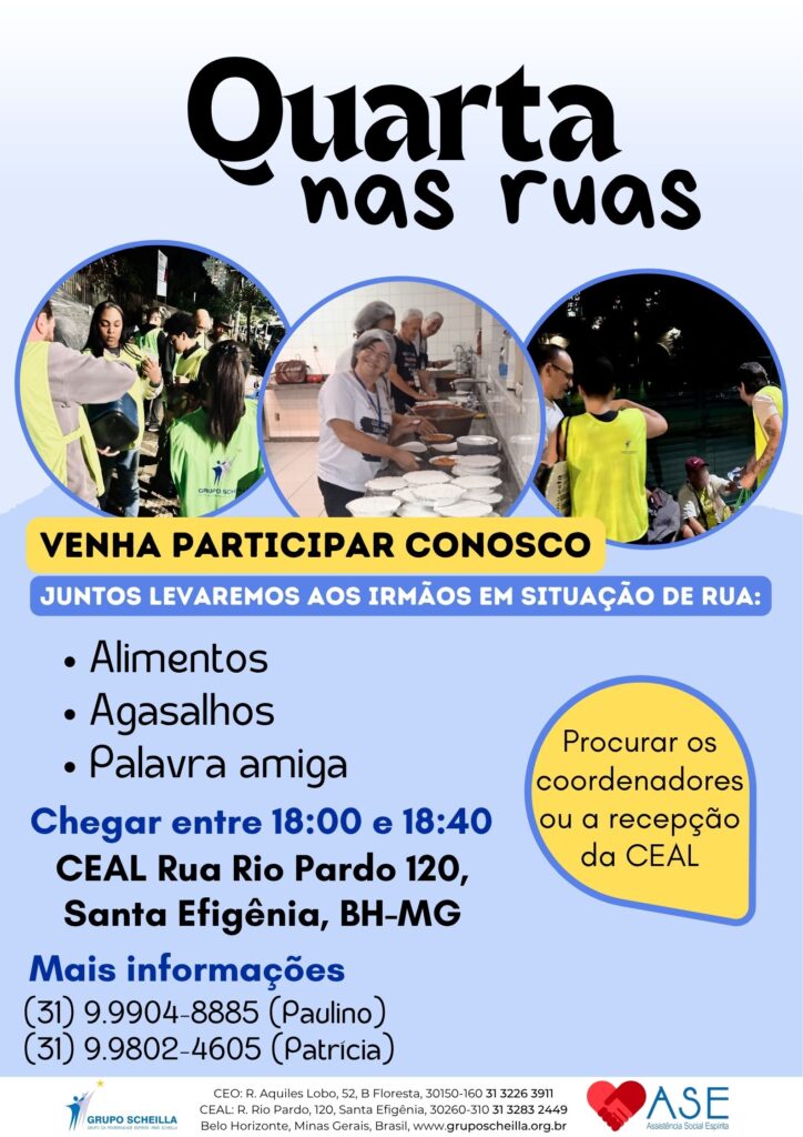 A Quarta do Amor nas Ruas é uma atividade semanal do Grupo da Fraternidade Espírita Irmã Scheilla, dedicada à assistência fraterna à população em situação de rua.