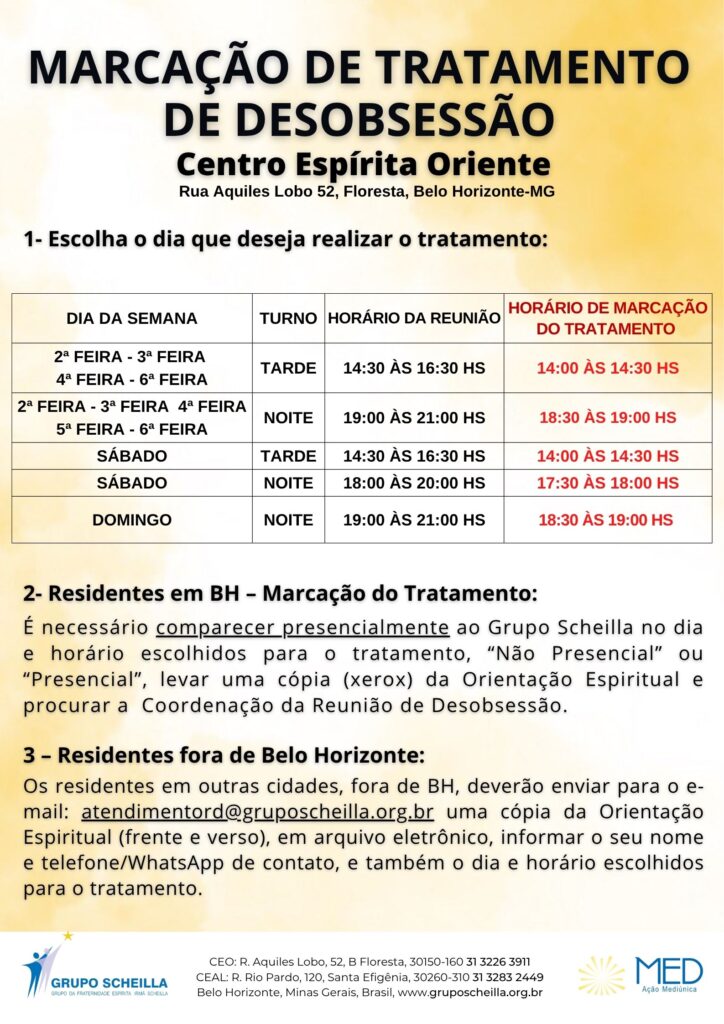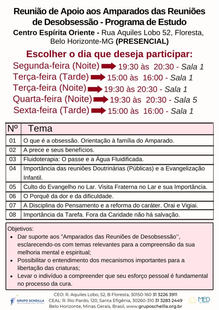 No dia do agendamento o Amparado poderá permanecer na primeira parte de estudo da Reunião de Desobsessão, e a seguir o “Amparado” será encaminhado para a Reunião Pública do dia.
